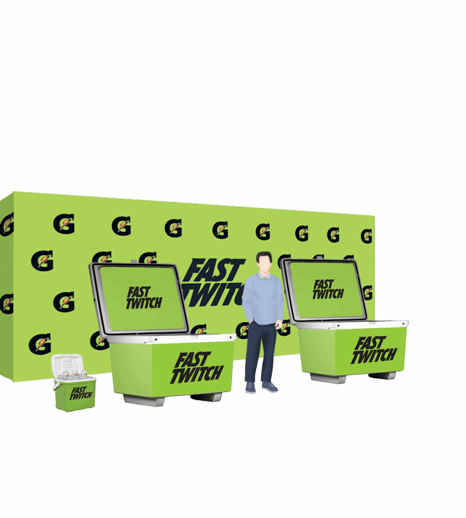 We sourced industrial-sized cooler bins typically used for large-scale food storage and worked with a cooler manufacturer to secure a rush order. These massive coolers were then sent to our printing partners, where they were vehicle-wrapped in high-end matte vinyl featuring bold Fast Twitch branding. The result was a set of human-sized “ice baths” that doubled as eye-catching, social media–ready set pieces.