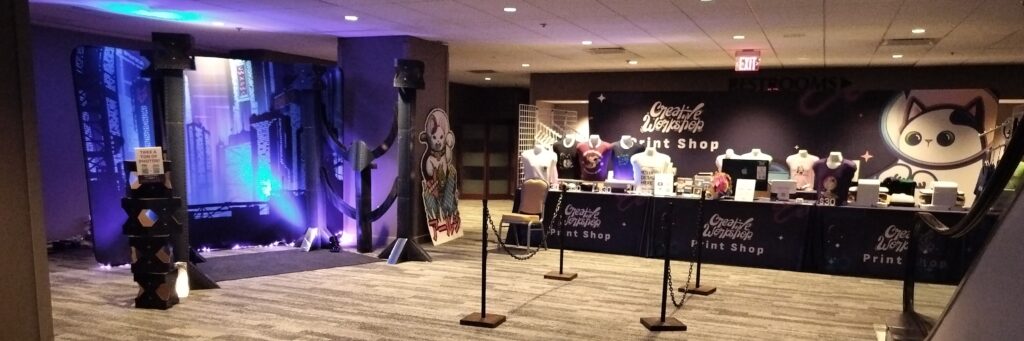 Partnering with Furry Weekend Atlanta was especially exciting because we weren’t just showing up as vendors, we were bringing the full Creative Workshop experience. Instead of white-labeling the activation, we proudly represented our own brand while collaborating closely with the FWA team. It was the perfect balance: honoring their theme, contributing to their vision, and still showing up as the designers within the Print Shop that make CW…CW!